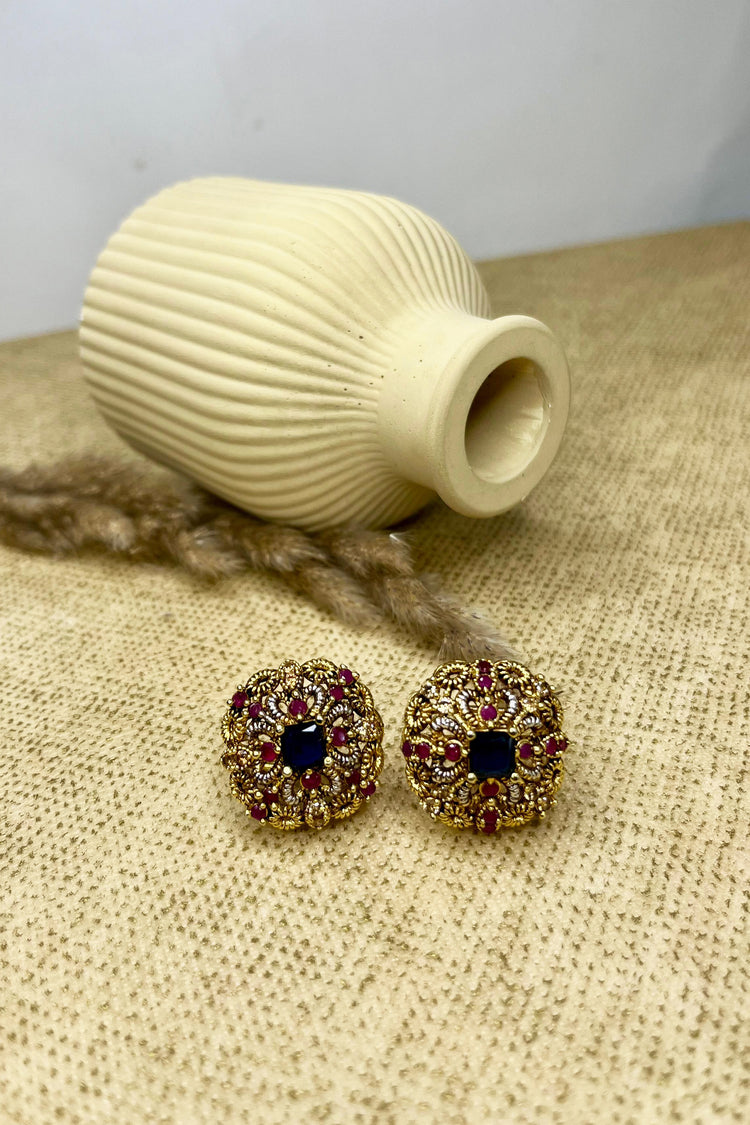 Unveil the poetry of heritage with the Zar-Nigar Studs. Meaning “golden gaze,” these opulent earrings captivate with a rich navy centerpiece, surrounded by intricate gold filigree and delicate magenta embellishments. The circular floral design evokes a vintage grandeur, while the detailed craftsmanship speaks of timeless luxury.
