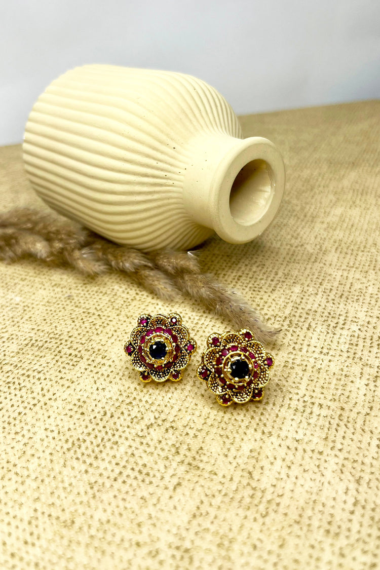 A tribute to timeless tradition and refined artistry, the Zareen Sitara Studs are crafted to dazzle. These intricately designed floral studs feature a striking emerald-green center stone, surrounded by glimmering ruby-toned accents and fine antique gold detailing.