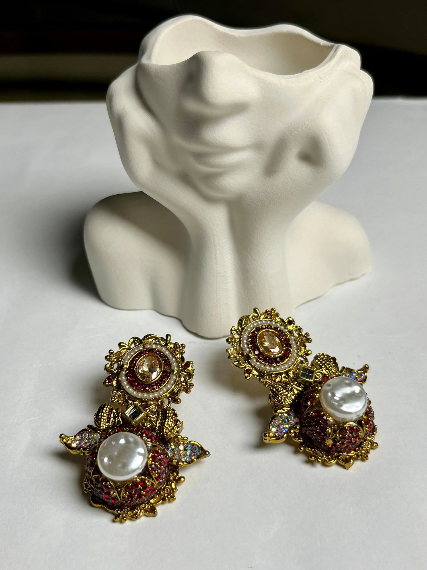 Handcrafted with gold-plated detailing, ruby stones, and a luminous pearl centerpiece β perfect for weddings, festive nights & modern wear.